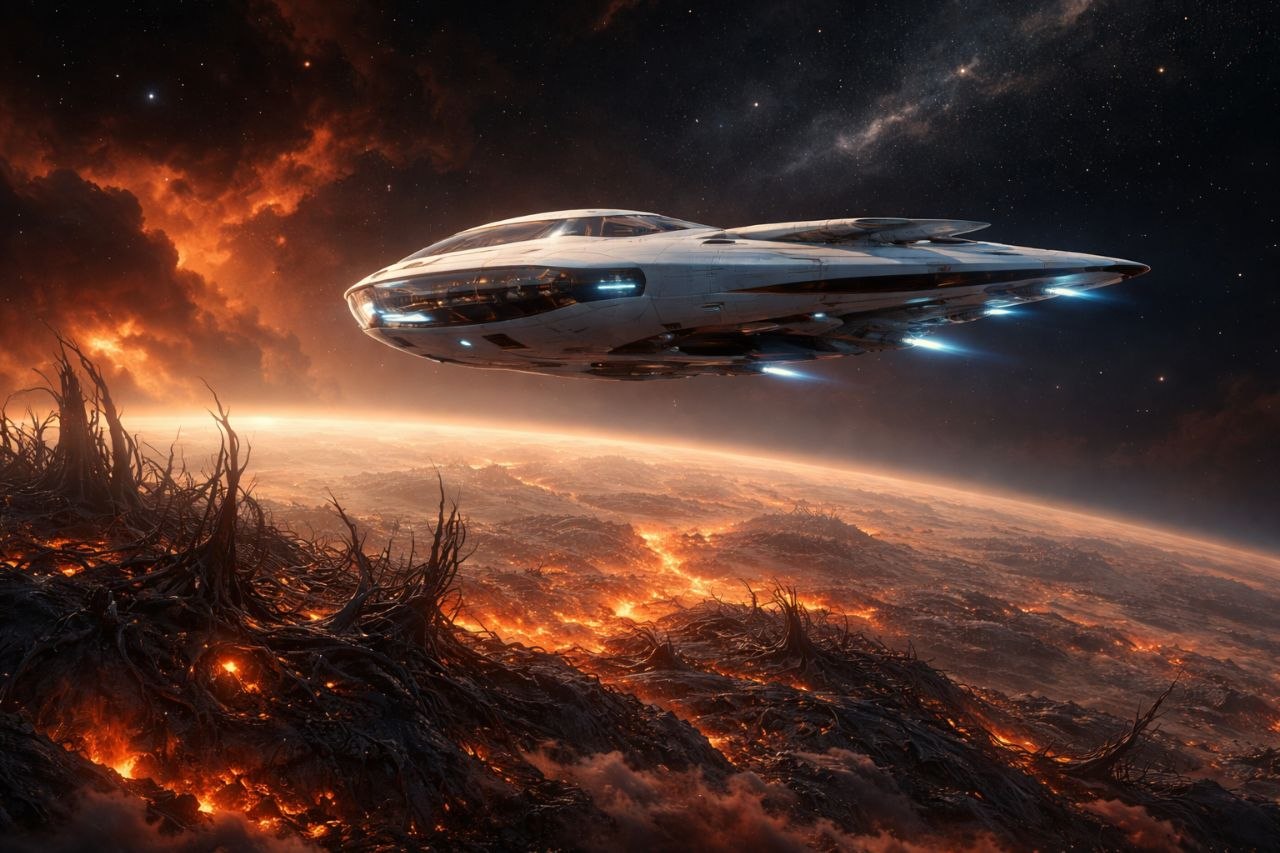 Он посадил корабль на горящую равнину. Небо было цвета запёкшейся крови. Воздух пах озоном и горелой плотью лесов. Местные жители, высокие и хрупкие, похожие на ожившие струны света, бежали от чёрных сгустков, которые ползли по их храмам, высасывая энергию из самого основания их мира.
