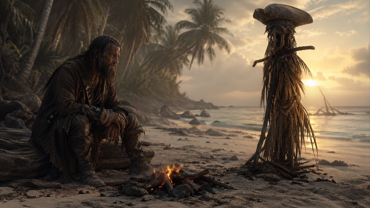 — Я каждый день смотрел на горизонт. Я построил шалаш, потом хижину. Я ловил рыбу. А потом я сделал его... Болвана. Из пальмовых листьев и палок. Надел на него свою треуголку. Назвал его Билл. Я разговаривал с ним по вечерам. Спрашивал: «Ну что, Билл, как думаешь, завтра придут?». И сам себе отвечал за него писклявым голосом: «Конечно, капитан, завтра обязательно».