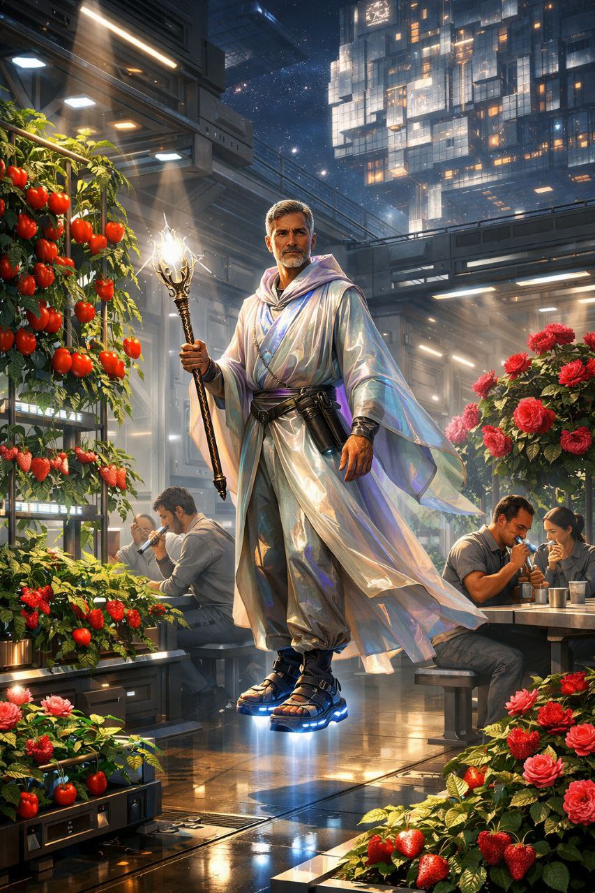 — Одежда… она как будто живая. Тонкая, струящаяся, обтекает тело, но не давит. Ткань переливается, как крылья стрекозы на солнце. А на ногах… странная обувь. В ней что-то гудит тихонько. Это магнитное поле. Можно сильнее сделать — и я лечу над землей, иду по воздуху. Можно слабее — ступаю как обычно.