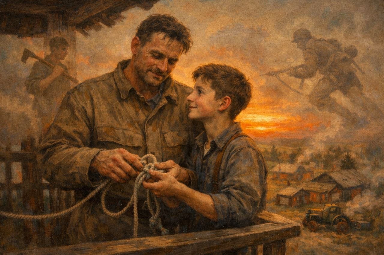 Дальше пошло как киноплёнка. Тридцатые годы. Советский Союз. Маленький городок, пахнущий мазутом и лесом. Отец — пожарный. Высокий, с большими ладонями, пахнущий дымом и хлебом. Он взял Сашку с собой на каланчу в пять лет. Он учил его завязывать узлы, не бояться высоты, разводить костёр спичкой с одной попытки.